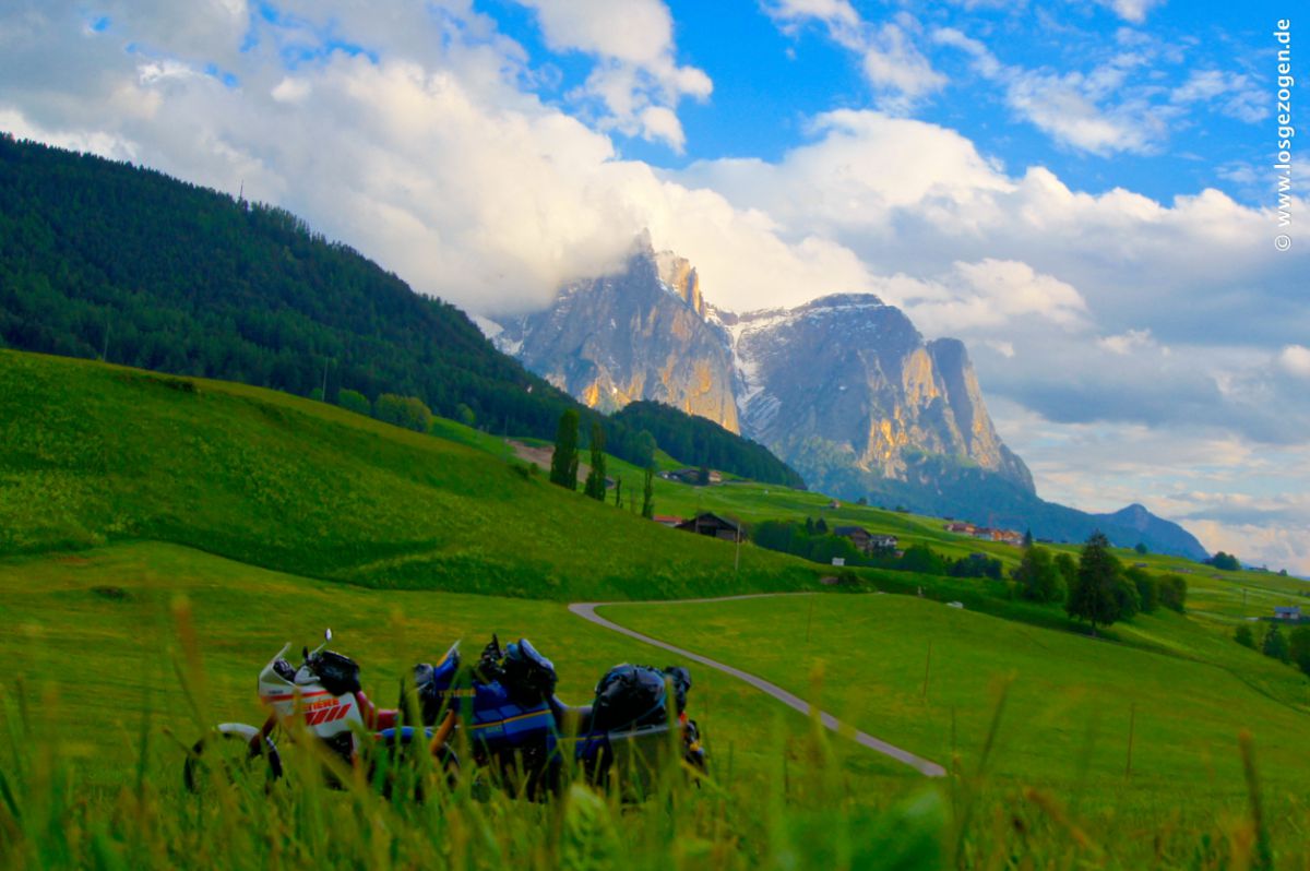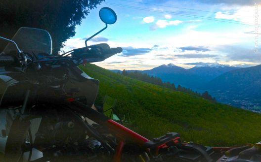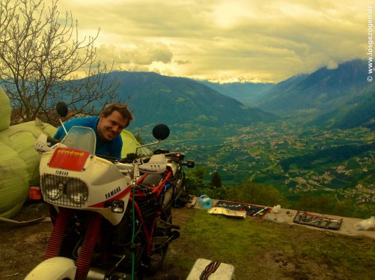 Hier ließ es sich wirklich aushalten. Damit wir nun auch wirklich einen Grund hatten länger zu bleiben und nicht allzu schnell wieder aufbrachen, wurde Tim unfreiwillig aus der Kurve eines steilen Feldwegs getragen und so richtig einen Südtiroler Hang hinuntergeworfen. Inklusive Purzelbaum. Resultat: Fahrer hat garnix, aber bei Tim sieht es schlimmer aus. Der linke Seitenkoffer ist so zerknautscht das sämtliche Haltenieten rausrissen wurden, rechter Spiegel abgeknickt. Nebenbei endeckten wir noch einen leicht undichten Tank. Na super! Wahrscheinlich sind wir inzwischen einfach mit so lächerlichen Dingen wie Ansaugstutzenwechsel unterfordert. Die Aussicht bei der Arbeit entschädigt.