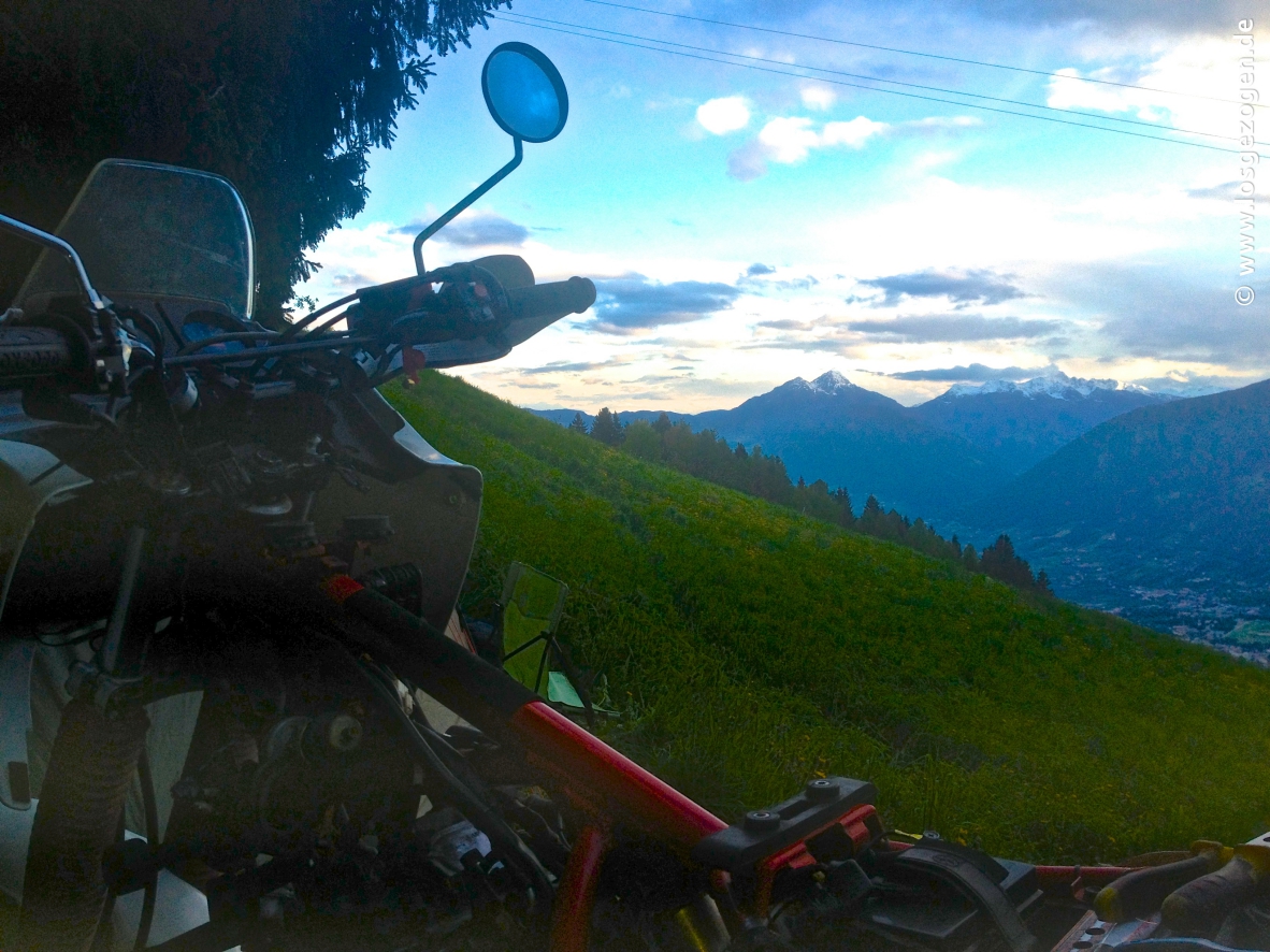 Ok der Winter war besonders lang im deutschsprachigen Raum dieses Jahr. Kann dann deshalb der Sommer nicht einfach um so schneller kommen ? Sozusagen, als ausgleichende Gerechtigkeit. Denkste ! Naja immerhin dürfen wir jetzt behaupten: Wir können jetzt auch Dauerregen und Kälte! Aber der Reihe nach. Erst gab es ein paar entspannte, sonnige Tage bei den Eltern in einer Ferienwohnung in Dorf Tirol bei Meran. So mit festem Dach und so. (-; Soweit, so gut. Dann jedoch direkt wieder zurück in die Wirklichkeit. Die neuen Ansaugstutzen für Lilly sind da! Die wollten auch eingebaut werden. Das Zelt schlugen wir deshalb weit oberhalb von Schenna bei einer sehr netten Familie mit Milchvieh auf dem Feld auf. Ein fantastischer Blick von hier oben über das ganze Tal gehörte auch dazu. Alles lag uns zu Füßen.
