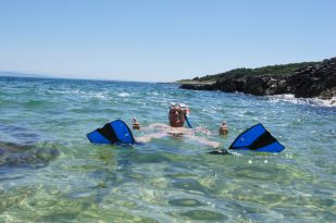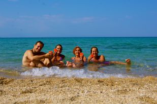 müssen. Das tut man nicht gerne, weil wir lieber noch ausführlicher und länger in die letzten Ländern, besonders Albanien, Mazedonien, eingetaucht wären. Aber wenn die Familie wartet, muss man halt Prioritäten setzen. Nun sitzen wir hier unten mit einem Becher Wein im Meer und erholen uns von den Renntagen. Warum nur trinken im Nass ?…. ? Es ist einfach ausserhalb zu warm ! Aber im Wasser geht es. Am Strand sitzend hält man es teilweise einfach nicht aus. So setzt man sich halt dort hin. Wir sind da keine Exoten. Die lokale Bevölkerung ist da teilweise professioneller als wir ausgestattet und nimmt gleich den Plastikstuhl und Tisch mit rein ins große Becken (Mittelmeer). Lasst euch sagen, dass sieht nicht besonders schön aus, ist aber ungeheuer effektiv. (-: