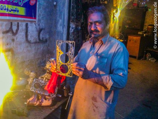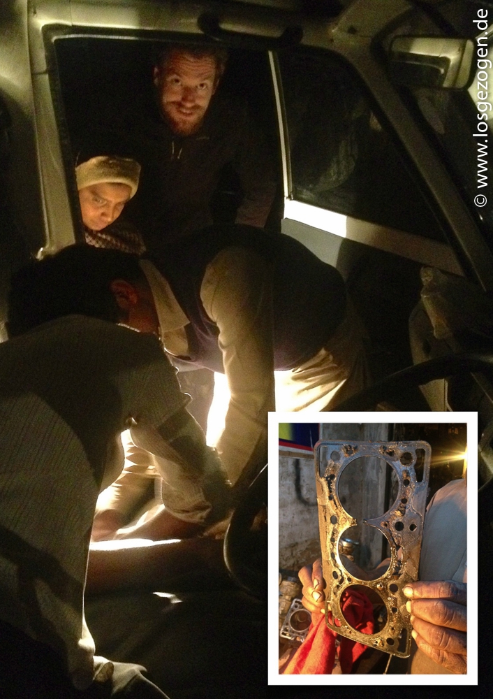 Nun kam, zugegebendermaßend mit deutschem Denken, die bittere Erkenntnis: Das ist ein wirtschaftlicher Totalschaden! Die Reparatur lohnt sich bei der alten Kiste nicht mehr. Wir können wohl mit dem öffentlichen Bus nach Hause fahren.“ Mitten auf dem Land waren wir nun gestrandet. In irgendeinem Nest hingen wir fest und es würde bald dunkel werden, aber Pakistan konnte einen auch hier immer wieder aufs neue überraschen. Der Werkstattleiter versprach, das wir in einer Stunde weiter fahren könnten. Er würde nur schnell die Zylinderkopfdichtung wechseln, die wäre nämlich defekt. Was? “Wie Bitte?“ Wie soll das denn gehen? Woher weiss er das überhaupt. Wir waren uns nicht sicher ob das irgendeine Diagnose war nur um uns noch möglich viel Geld aus der Tasche zu ziehen und uns endlos hier zu behalten. Eine Kopfdichtung zu wechseln dauert in Deutschland oft einen vollen Arbeitstag und je nach Fahrzeug kann man für diese Aktion auch locker einen halben deutschen Monatslohn einrechnen. Sind wir hier etwa bei einem Ralley Pitstop gelandet? 1500 Rupien (ca.10€) sollte kosten, entgegnete er daraufhin nüchtern und wir sollten uns überhaupt keine Sorgen machen. Keine große Sache. Es sei die Kopfdichtung! Er wüsste das ganz genau. In gut einer Stunde könnten wir weiterfahren.