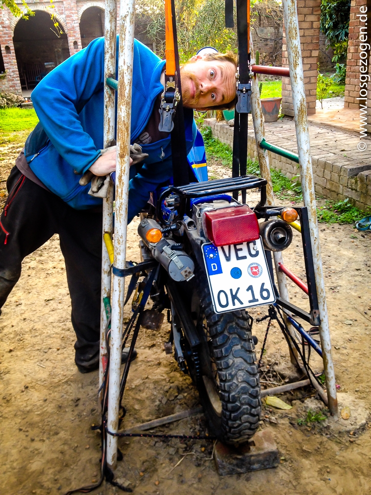 Auf dem Weg zu einer Art Restaurant wollte dann leider zu allem Überfluss auch noch unser alter Suzuki “Bolan“ die volle Aufmerksamkeit. Er zog plötzlich nicht mehr. Keine Leistung mehr. Wir schleppten nur mit Mühe zu irgendeiner Werkstatt im nächsten Dorf.