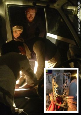 Volljährig oder nicht, es waren viele. Ein kleiner Junge von nichtmal 10 Jahren reichte in nächster Zeit fleissig Maulschlüssel, Gabelschlüssel, usw.... an. Alle anderen stürmten in das Auto und an allen Stellen wurde nach dem Ameisenprinzip gleichzeitig die Verkleidung, Sitze, Anbauteile entfernt um an den Motor zu kommen und ihn schliesslich auseinander zu nehmen. “Ob die auch das was sie dort zerlegen, jemals wieder zusammen bekommen? fragten wir uns und waren weiterhin überhaupt nicht überzeugt. Nach 30 Minuten hielt der Chef dann plötzlich die ausgebaute defekte Zylinderkopfdichtung triumphierend in der Hand. Er hatte recht gehabt. Die Dichtung war zwischen erstem und zweiten Zylinder gerissen. Nun kam aber noch der Zusammenbau.... Die Kiste sollte ja auch nachher wieder laufen. Unglaublicherweise schafften Sie es tatsächlich in der sagenhaften Zeit von einer Stunde und 20 Minuten, dass wir wieder vom Hof rollen konnten und auch anscheinend alle Schrauben wieder den richtigen Platz gefunden hatten. Dieses “Formeleins-Werkstattteam“ hatte uns schwer beeindruckt. Die Karre lief!