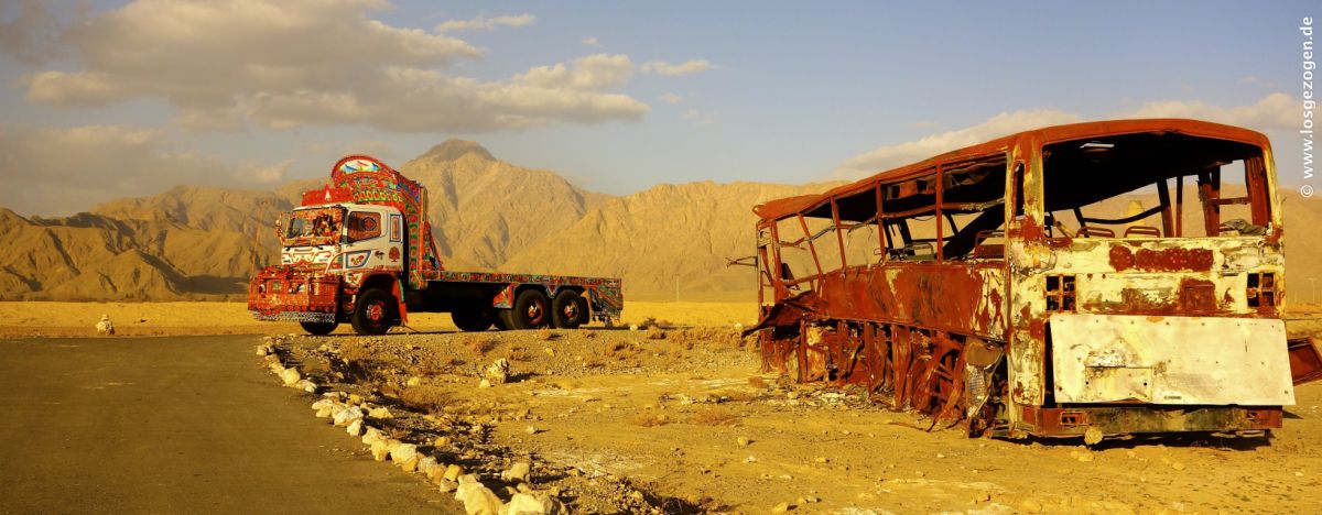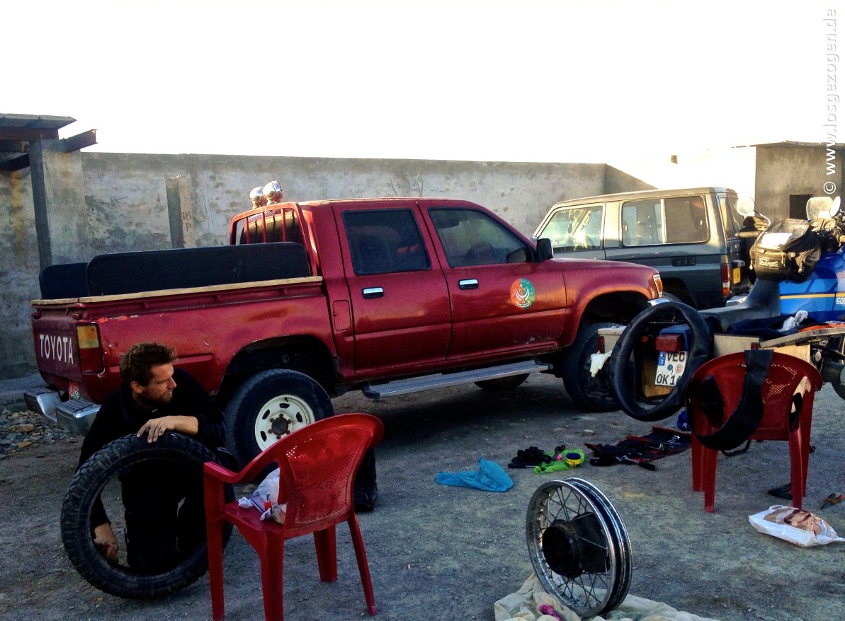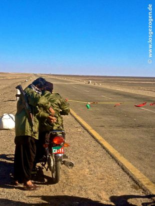 Am nächsten Morgen ging es dann auch früh los. Zu mindestens die Polizei war ja nun schon mal pünktlich da und was sollte da noch groß schief gehen. Grenze wir kommen! Heute Abend haben wir den halben Weg nach Quetta und damit ein drittel der gefährlichen Strecke hinter uns, da waren wir uns vollkommen sicher. Auf die Nachfrage wie lange es dauern würde, meinte unser "Mister Security Polizei" nur, "Heute Nachmittag seit ihr in Taftan!" Na klar, dachten wir, wieder ein Iraner der der englischen Sprache nicht mächtig ist. "Heute Nachmittag sind wir drei Kollegen in Dalbandin und haben die halbe Strecke nach Quetta hinter uns!", entgegneten wir. Keine Antwort seinerseits.