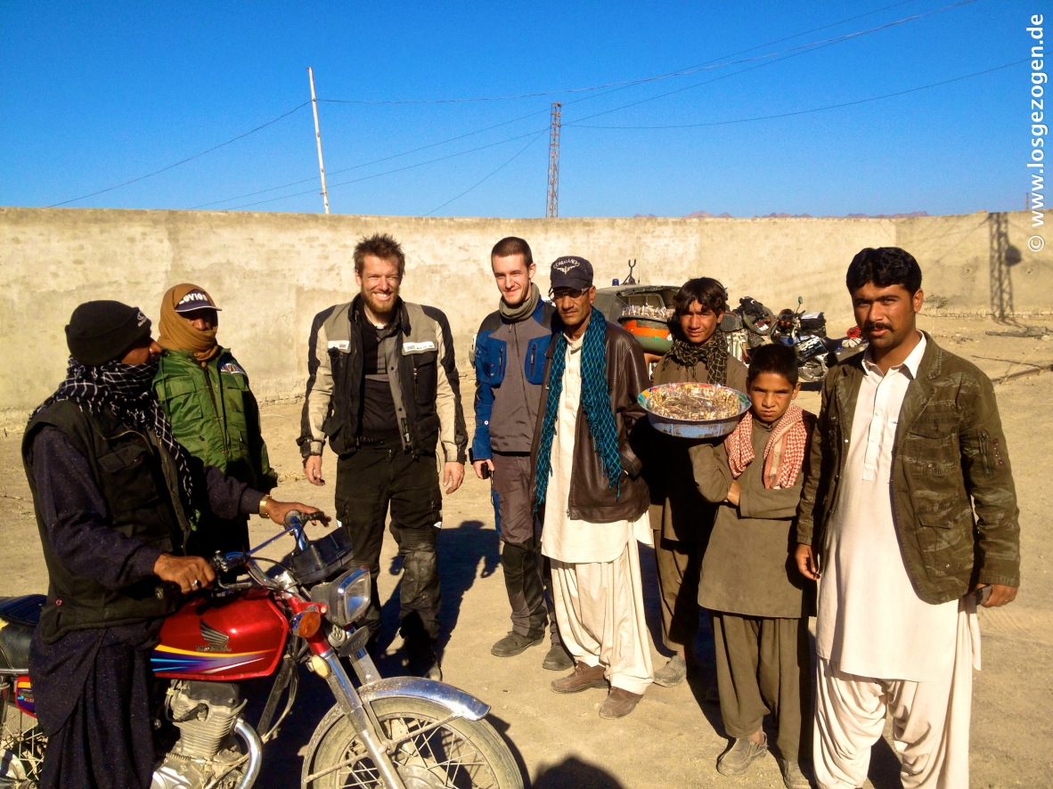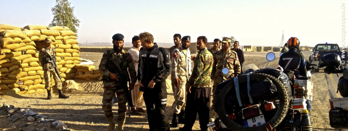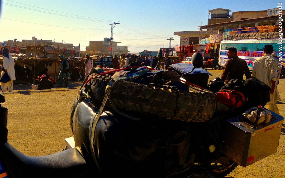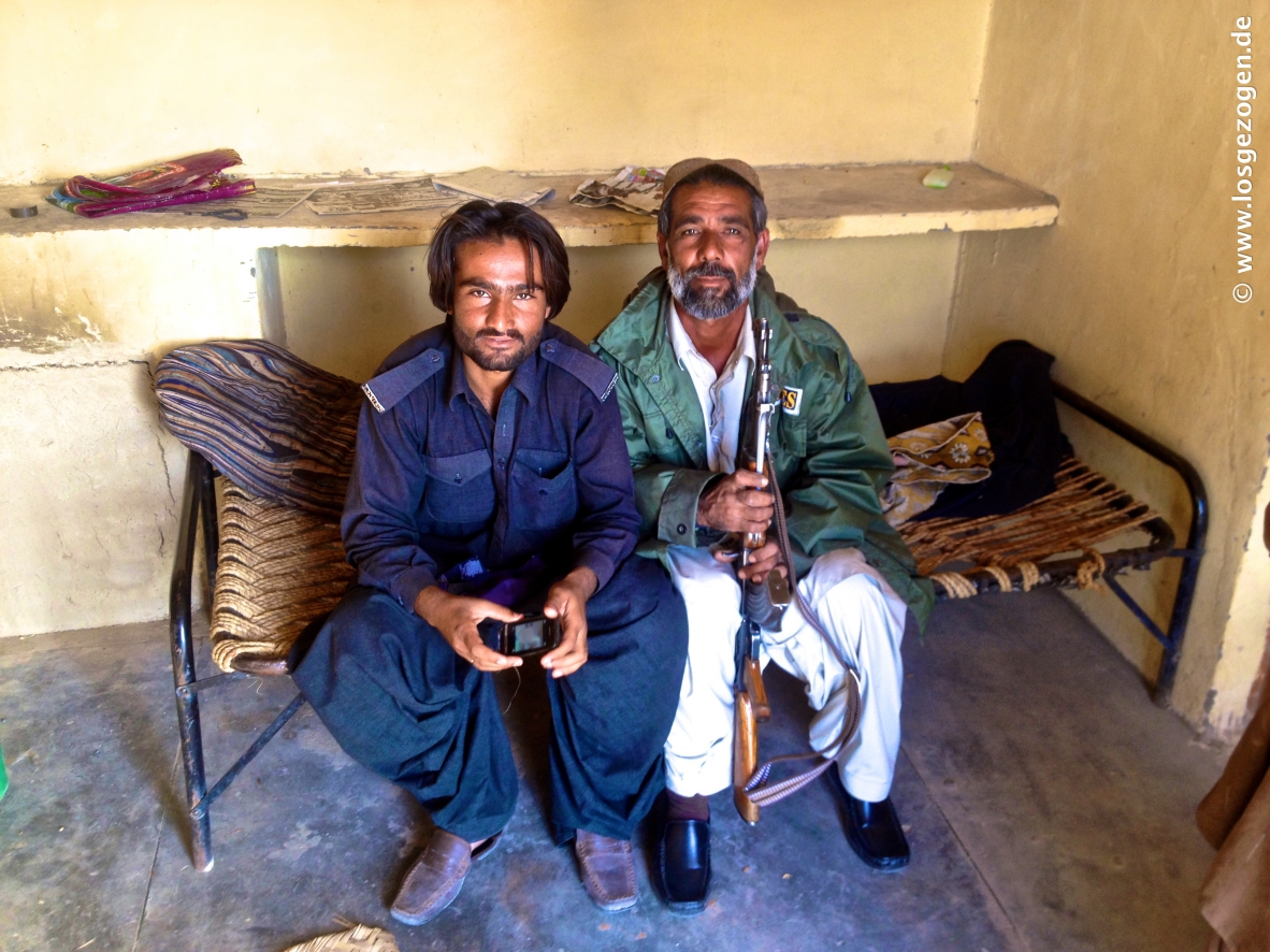 Nun mal besser erstmal schnell los, aber da hatten wir die Rechnung ohne unsere ausgebuffte "Leibgarde" gemacht. Es ging wirklich los, aber nur bis zum ersten Checkpost, ungefähr 1 km weiter.... Hier wurden wir an das nächste Kollegenfahrzeug übergeben, die uns zur Station oder Stadtgrenze brachten. Dies war nun vorläufig und gleichzeitig die vorzeitig Endstation, wie sich später herausstellte. Das ganze natürlich mit lautem Gehupe und Sirenengeheul und ohne für uns ersichtlichen Grund. Nach dem Motto: Seht alle her! Hier kommen sie! Die Idioten, die so blöd sind durch diese Gegend zu fahren! Alles drehte sich natürlich um, stoppte, tuschelte und jetzt wusste innerhalb Minuten auch der letzte schlafende Talibanspitzel oder Belutschiseparatist in der Stadt das wir da waren. Hier kommt heisse Auslandswahre!, informiert schon mal die Kavallerie. Diskret und professionell sieht wohl anders aus. Nun konnten wir uns also Zeit lassen. Alle bösen Jungs waren von hier bis ins entfernte Quetta nun wahrscheinlich sowieso schon im Bilde. Es gab eh nur eine Richtung und eine Straße auf der wir fahren werden. Ausweichen unmöglich. Irgendwann werden die Deutschen also schon kommen. "Geduld ist eine Tugend" und das sollten wir nun eingehämmert bekommen.
