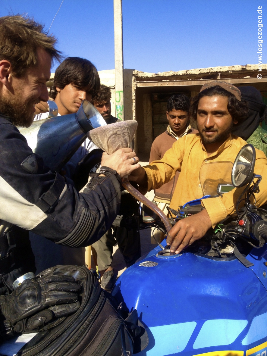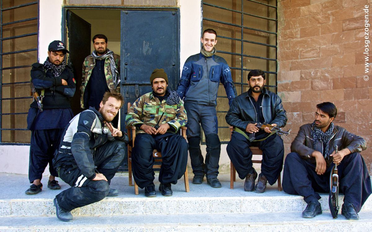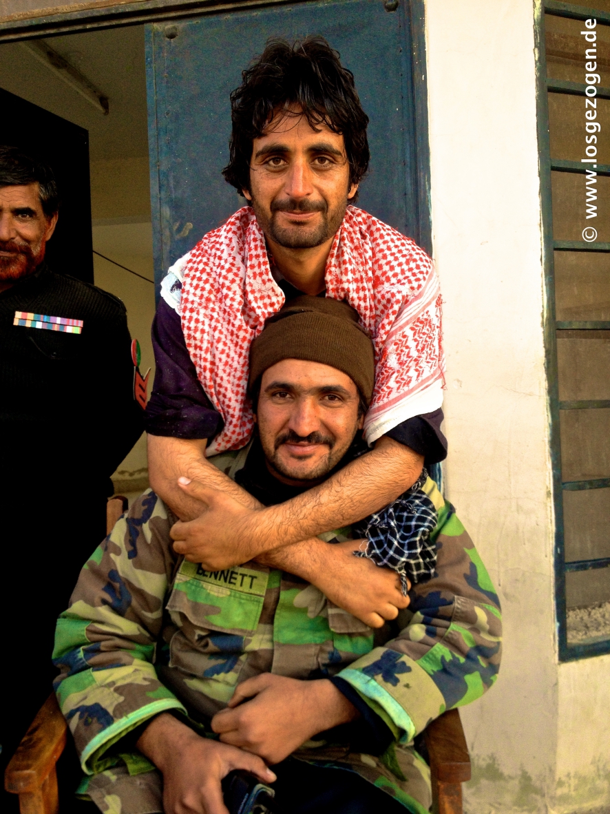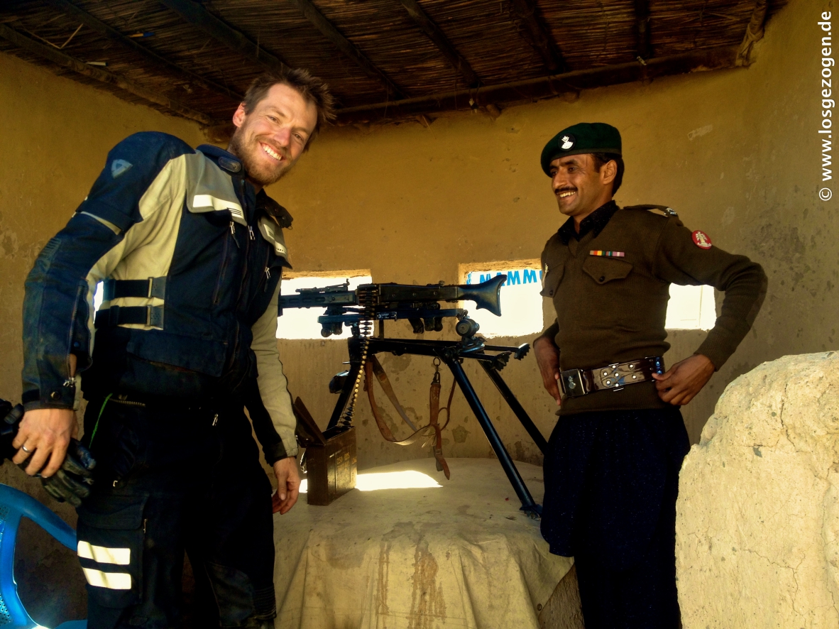 Nun mal besser erstmal schnell los, aber da hatten wir die Rechnung ohne unsere ausgebuffte "Leibgarde" gemacht. Es ging wirklich los, aber nur bis zum ersten Checkpost, ungefähr 1 km weiter.... Hier wurden wir an das nächste Kollegenfahrzeug übergeben, die uns zur Station oder Stadtgrenze brachten. Dies war nun vorläufig und gleichzeitig die vorzeitig Endstation, wie sich später herausstellte. Das ganze natürlich mit lautem Gehupe und Sirenengeheul und ohne für uns ersichtlichen Grund. Nach dem Motto: Seht alle her! Hier kommen sie! Die Idioten, die so blöd sind durch diese Gegend zu fahren! Alles drehte sich natürlich um, stoppte, tuschelte und jetzt wusste innerhalb Minuten auch der letzte schlafende Talibanspitzel oder Belutschiseparatist in der Stadt das wir da waren. Hier kommt heisse Auslandswahre!, informiert schon mal die Kavallerie. Diskret und professionell sieht wohl anders aus. Nun konnten wir uns also Zeit lassen. Alle bösen Jungs waren von hier bis ins entfernte Quetta nun wahrscheinlich sowieso schon im Bilde. Es gab eh nur eine Richtung und eine Straße auf der wir fahren werden. Ausweichen unmöglich. Irgendwann werden die Deutschen also schon kommen. "Geduld ist eine Tugend" und das sollten wir nun eingehämmert bekommen.