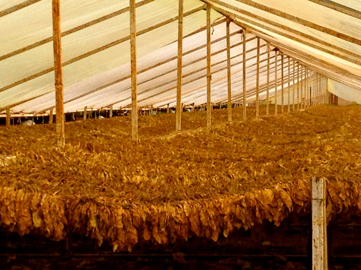 Frisch geernteter Tabak in Zelten zum Trocknen aufgehängt