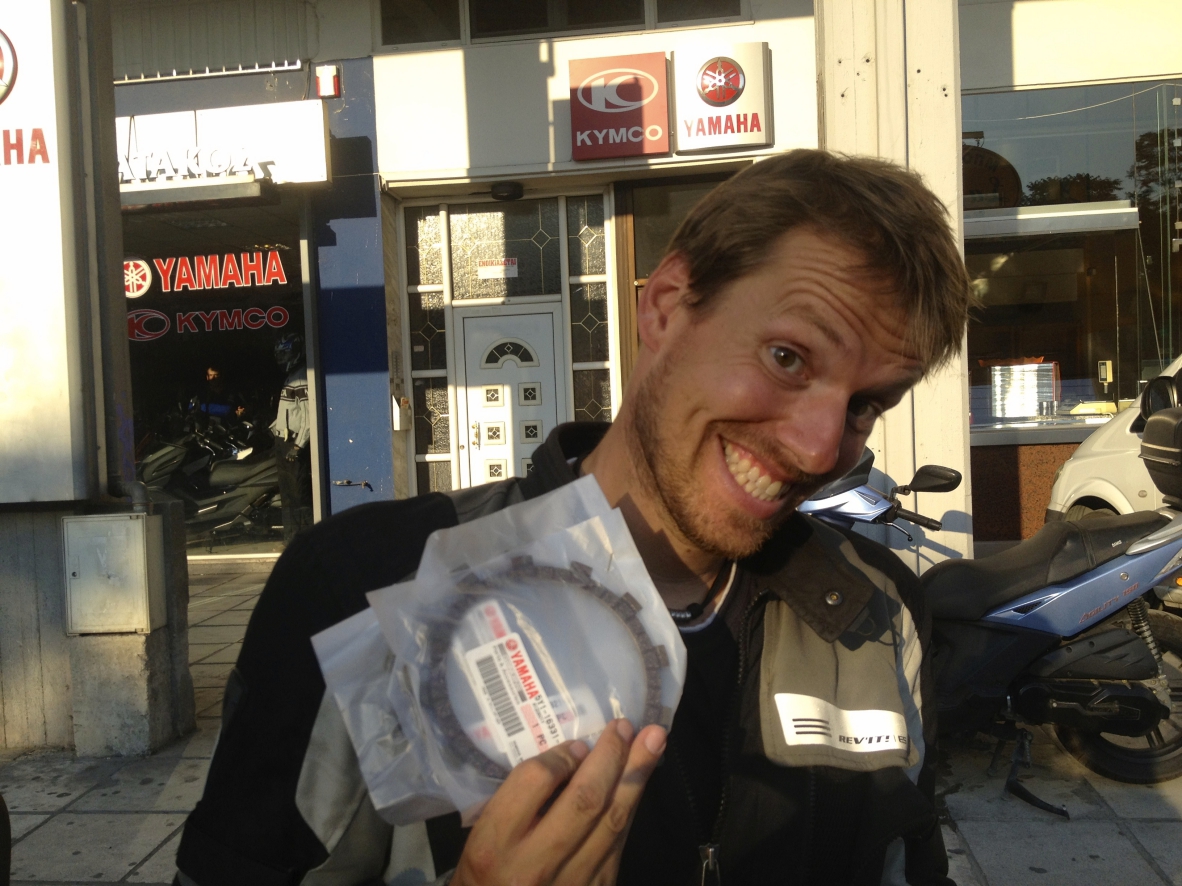Deshalb flog die Familiendelegation auf Urlaub schon mal von Thessaloniki in Richtung Istanbul zum Start der zweiten Etappe unserer gemeinsamen Griechenland-Türkei Rundreise vor und wir sollten, inzwischen wieder auf den Lasteseln, hinterher tuckern. Jedoch gab es schon Tage vorher, erfolgreich verdrängte Probleme, mit einer durchrutschenden Kupplung bei Tim. Nun holten Sie uns gnadenlos wieder ein. Wir schlichen also förmlich die letzten Kilometer nach Thessaloniki rein und kauften bei Yamaha, kurz vor Ladenschluss, neue Kupplungsreibscheiben.