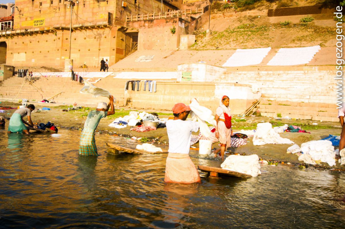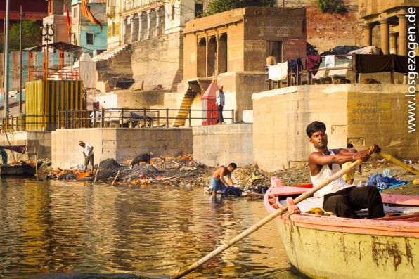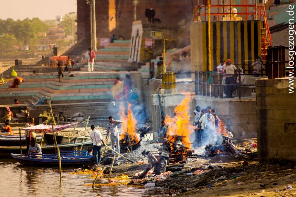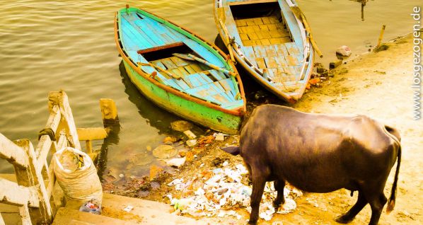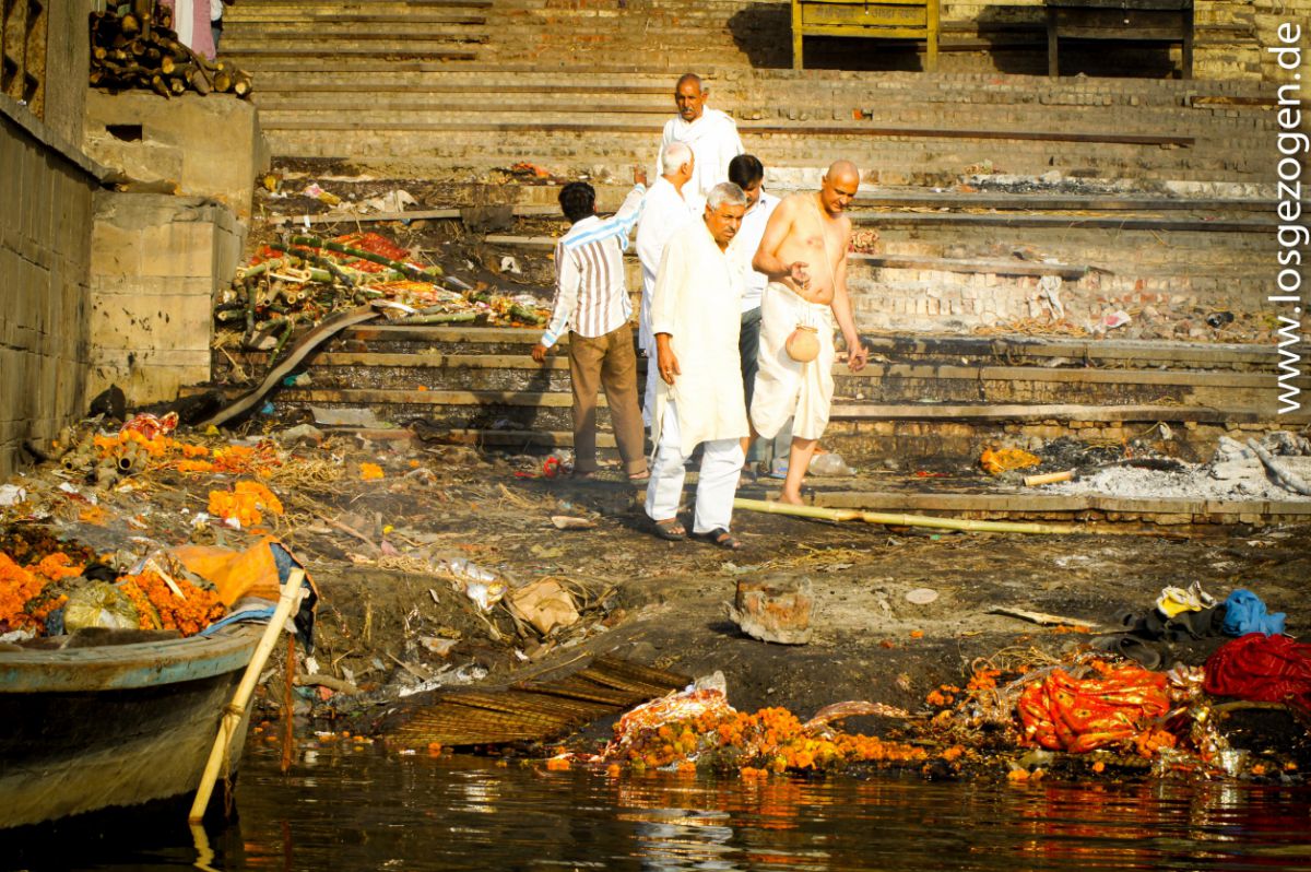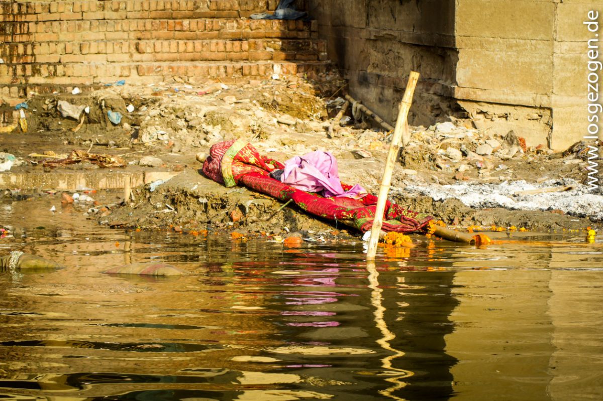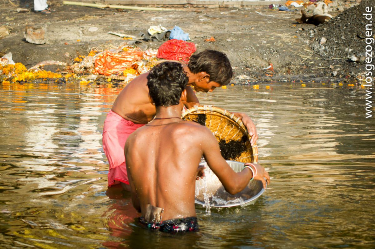 Für uns eine wirklich unschöne Vorstellung beim Schwimmen eventuell mit einer Wasserleiche zusammenzustoßen oder beim Gang am Ufer einer Angeschwemmten zu begegnen. Ständig starrte man wie gebannt aufs Wasser und vermutete ständig in all den treibenden Teilen irgendwo dergleichen entdeckt zu haben. Da die meisten Inder jedoch nicht schwimmen können, weswegen sie beim Baden immer in der Nähe des Ufers bleiben oder sich alte Plastikflaschen als Auftriebshilfe auf den Rücken schnallen, passiert ersteres zumindest wohl eher selten.