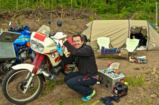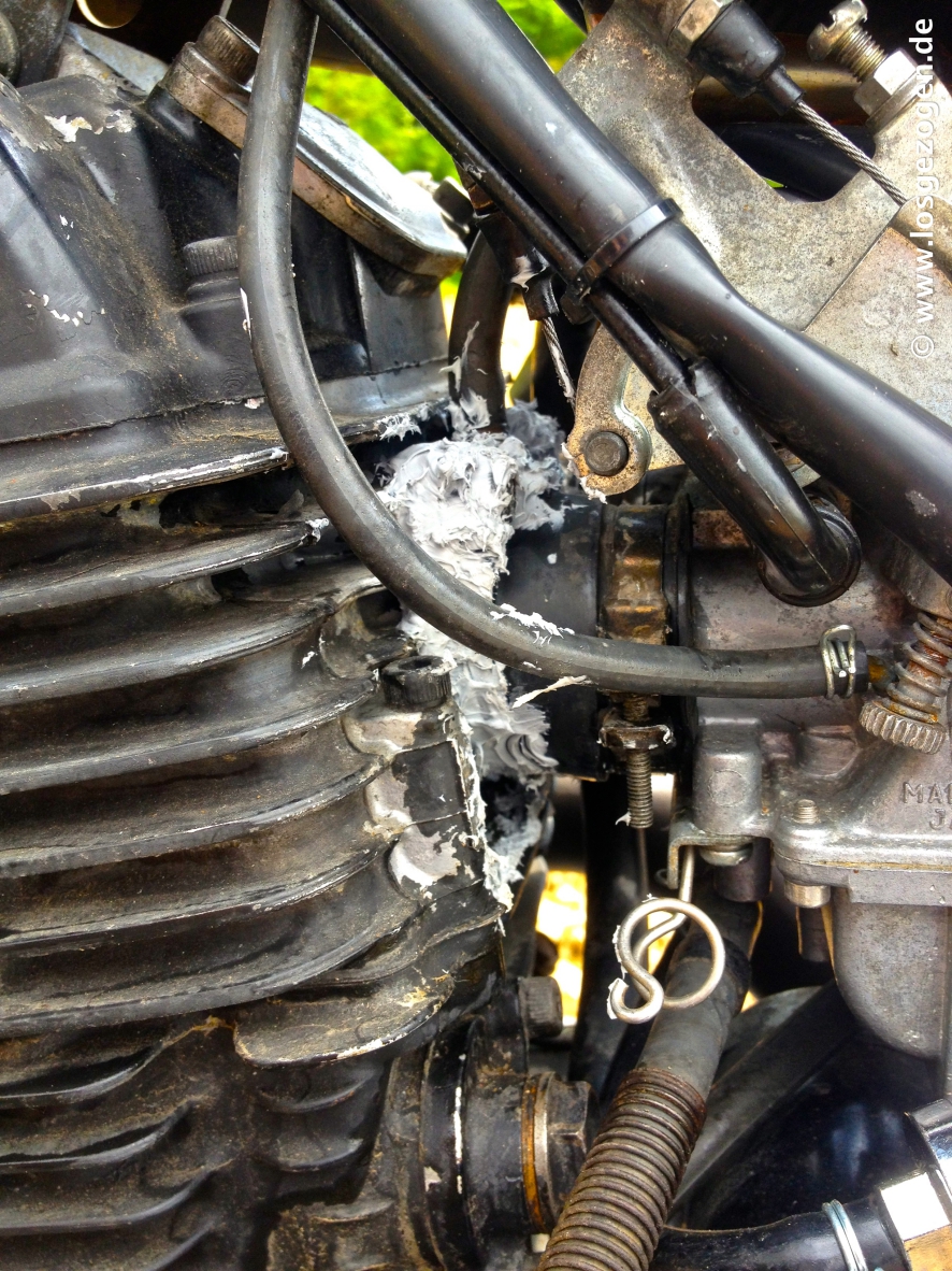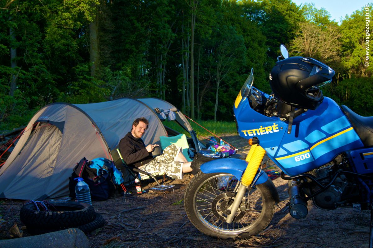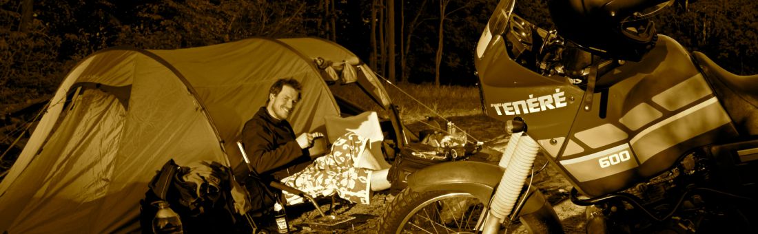Relativ schnell merkten wir jedoch, dass unsere Vergaser wohl komplett falsch eingestellt waren. Zwei Tage vorher hatten wir nämlich unsere Nadeln in Primär- und Sekundärvergaser nochmal schnell umgehängt, um laut Internet noch ein bisschen mehr Leistung aus unseren Gäulen rauszuholen. Kein kluger Einfall dies nicht ausgiebig zu testen und es dazu auch noch gleichzeitig an beiden Maschinen durchzuführen.... Wie war der Spruch: " Never touch a running System" kam mir sofort wieder in den Sinn.... Ständig gingen unsere Kisten nun aus und liefen wie der bekannte Sack Nüsse. Aber zurückfahren und reparieren ging natürlich mal gar nicht. Da standen womöglich noch Leute winkend auf dem Hof, wenn wir 15 Minuten später wieder zurück gewesen wären. Kommt bestimmt nicht allzu souverän, dann direkt wieder in der Garage zu verschwinden. Nein wir wollten fahren. Immer weiter. Also hielten wir nicht an und wollten trotz der Probleme sogar schnell noch Frankreich erreichen. Man muss halt die Vorteile Nutzen, wenn man im Dreiländereck losfährt, dachten wir uns. Krabben aus dem Land der Esskultur sollten es unbedingt zu Beginn der Reise, jedoch vor Ladenschluss um 21 Uhr, sein. Also stotterten wir so gut es ging hin. Immer wieder erfolgte jedoch das Anschieben der ausgegangenen und viel zu schweren Moppeds, die auf Grund der zu kurzen Ladezeiträume, inzwischen unter chronisch leerern Batterie litten. Es darf zu unserer zusätzlichen Schande dabei natürlich nicht unerwähnt bleiben, dass wir dabei mit den störrischen Eseln mehrfach umfielen und neben einem kaputten Blinker, einem herausgerissen Kupplungsgriff die Seitenkoffern nach einiger Zeit total zerknautscht aussahen. Ich muss nicht erwähnen das es an dieser Stelle jetzt natürlich anfangen musste zu regnen. Zudem hatte Carrefour heute natürlich nur bis 20 Uhr geöffnet. Also nix mit Gourmetessen. Wie soll's bei einem solchen Start auch anders sein. Wir hatten also einen richtigen Lauf... Unseren ersten Zwangstopp der grossen Reise legten wir somit nach nur 50 km von "zu Hause" bei stockdunkler Nacht und Regen am Rand eines Feldes wieder zurück auf deutscher Seite ein. Das wars für den Tag. Nix läuft. Also blieb nur noch Zelt aufbauen und dann erstmal Gute Nacht. Am nächsten Tag konnte es ja nur besser werden. Die nun nächsten Tage am "Feldrand" vergingen nun ziemlich schnell. Zuerst schliefen wir ausgesprochen viel. Die Etappe vor "Losgezogen", ich bezeichne Sie mal rückblickend als "Das Wegkommen", oder auch des "Wahnsinn fette Beute" jenachdem wie man will. Sie hat jedoch anscheinend doch erstaunlich viel Kraft gekostet. Wochenlang plante, organisierte und bereitete man vor. Somit war der erste Tag quasi im nu verpennt. Nun teilte man noch Freunden, Eltern und Bekannten mit, das es wunderbar laufe und nur ein paar Kleinigkeiten wohl noch nicht ganz so sauber liefen und somit wir quasi sofort weiterfahren könnten. Es handele sich lediglich um das letzte Feintuning. Aus dem Sofort wurden dann noch eben zwei Tage durchreparieren (Vergaser einstellen, Umfallerschäden beseitigen,...) Zusätzlich wurde uns dabei klar, dass an Cocos Maschine definitiv die Ansaugstutzen porös waren. Ab sofort wird Sie hier mit dem Namen Lilly bezeichnet. Ollis Maschine heisst übrigens Tim. Die Stutzen hatten wir noch vor einer Woche als i. O. deklariert haben.... Sie zogen Nebenluft und es war einfach kein stabiler Leerlauf einzustellen. Eine "Viel-hilft-Viel" Dichtmassennotreparatur, mit inklusive wunderschön verschmiertem Motor, musste nun erstmal für überhaupt einen Lauf herhalten.