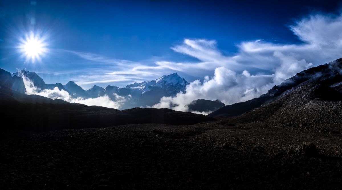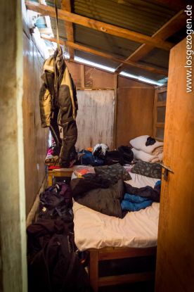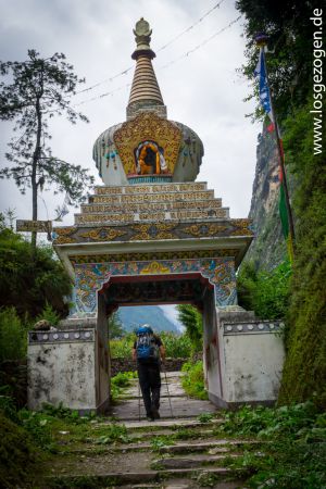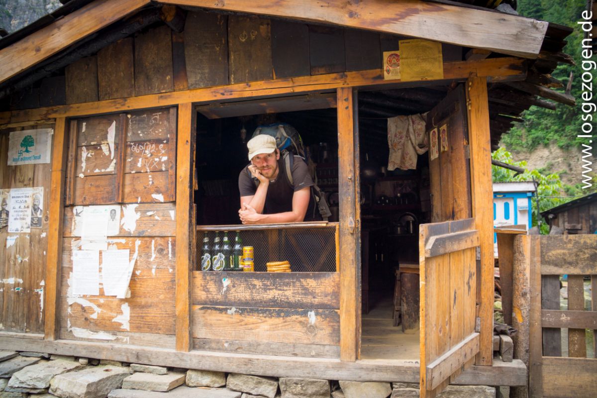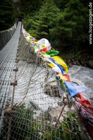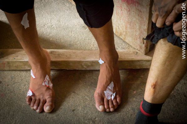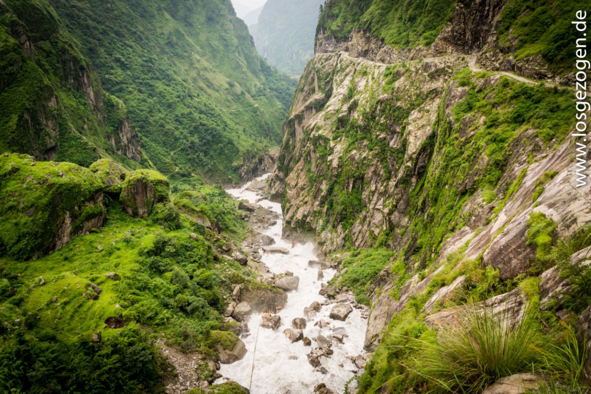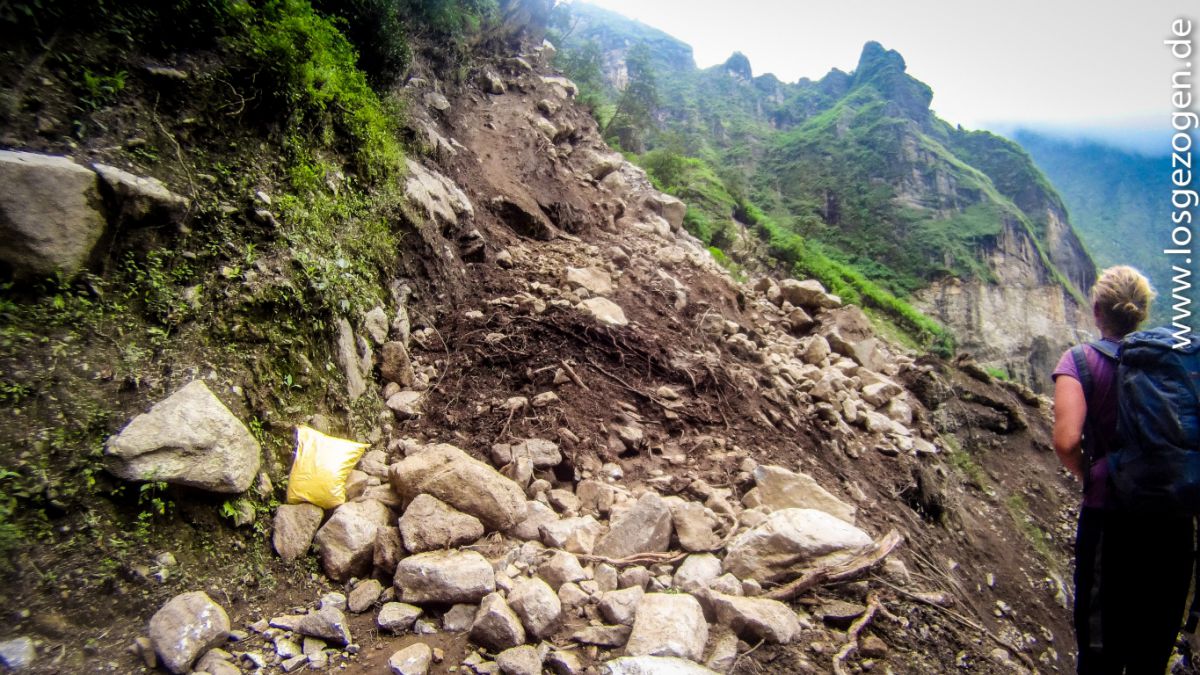 Wir haderten kurz, ob wir es riskieren sollten das lose Geröllfeld, das sich uns bot, zu durchqueren. Die Träger machten es uns zwar die ganze Zeit vor und so sahen wir zumindest, dass sie nicht gleich in die Tiefe gerissen und verschüttet wurden, aber noch wagten wir selber keinen Schritt vorwärts. Dann lief ein älterer Mann an uns vorbei und nachdem er die Mitte erreicht hatte, ließen wir letztendlich alle Zweifel über Bord fallen und folgten ihm. Er war wohl fast so alt wie wir beide zusammen, aber barfuss lief er behände durch das Katastrophengebiet. Er sagte uns im Vorbeigehen wir sollen die Schuhe ausziehen und: