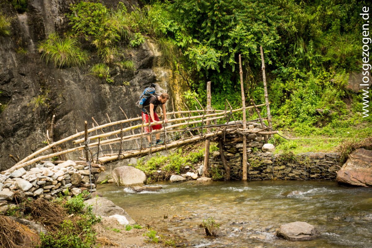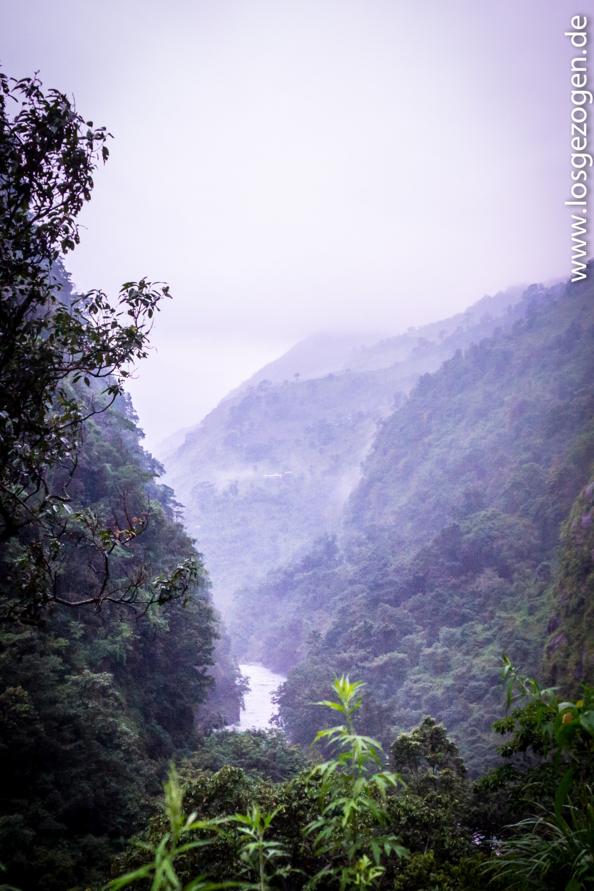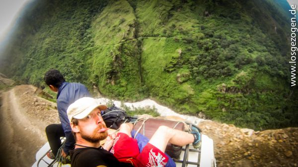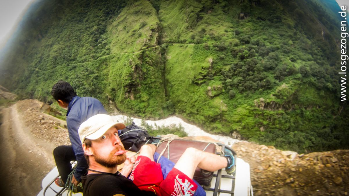 Die Jungs hatten recht. Auf dem Dach war die Hölle los. Man musste wirklich extrem aufpassen nicht herunter zu fallen. Der alte Wagen ächzte, die Gepäckstücke auf dem Dach waren nur notdürftig verschnürt und deshalb darauf sitzend die reinste Rutschpartie. Ein Festhalten nur durch ständiges festkrallen mit Händen und Füßen an den Stahlstreben des Gepäckträgers möglich. Kurze Zeit später bedauerten wir schon die Entscheidung den Jeep genommen zu haben. So viel schneller als zu Fuß ging es an vielen Stellen dann auch nicht. Oft war dann an sehr schmalen Passagen dann auch wieder nur Schritttempo oder Absteigen und Laufen angesagt. Welche unserer beiden Fortbewegungsvarianten in den letzten Stunden nun insgesamt anstrengender waren und wo wir letztendlich mehr Kalorien verloren hatten war nicht ganz klar…Unsere Arme spürten wir zumindestens bald nicht mehr. Bei einigen Neigungen des Fahrzeugs immer nahe am Abhang stockte uns zudem der Atem, da wir am höchsten Punkt vom Fahrzeug natürlich auch den größten Ausschlagsweg hatten. Oft konnten wir so weit über den Rand in die Tiefe schauen, dass es aus unserer Perspektive so aus sah, als ob wir gerade kippen würden. Sekunden erschienen einem wie Stunden. Jetzt bloß nicht abrutschen. Zudem hatte sich doch der Angstschweiß, an den Handinnenflächen ausgebreitet, so dass diese auch noch glitschig waren. Stand das Fahrzeug mal für einige Zeit still oder die Strecke war überschaubar in Ordnung, so musste man sich schnell die Hände abtrocknen, um für die nächsten Kurve wieder „Gripp“ zu haben. Die Tatsache das Nepalis und Inder leichtfüßig auf den Dächern von Autos, Reisebussen oder Zügen saßen, muss mit ihrem geringen Eigengewicht zusammenhängen oder Shiva redet da noch ein gehöriges Wörtchen mit. Nur so können wir uns das erklären. Entspannt ist auf jeden Fall ganz anders.