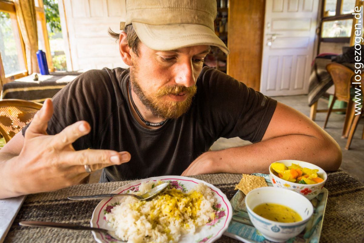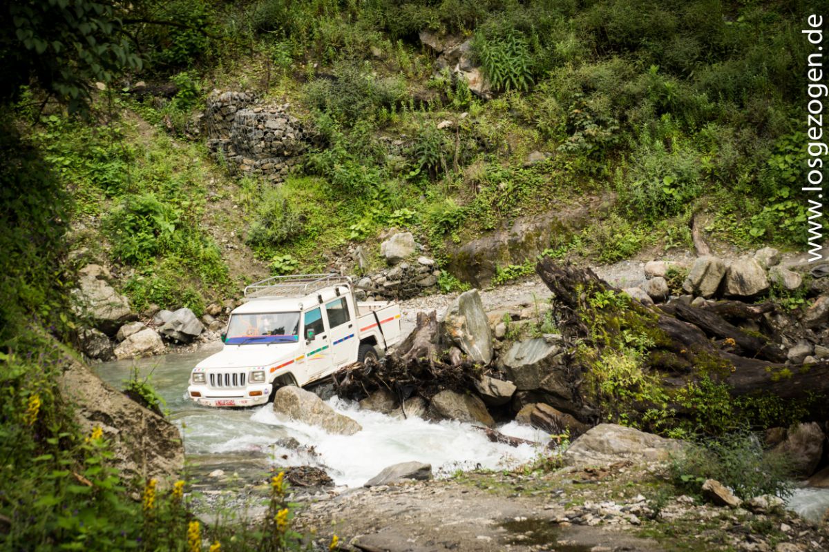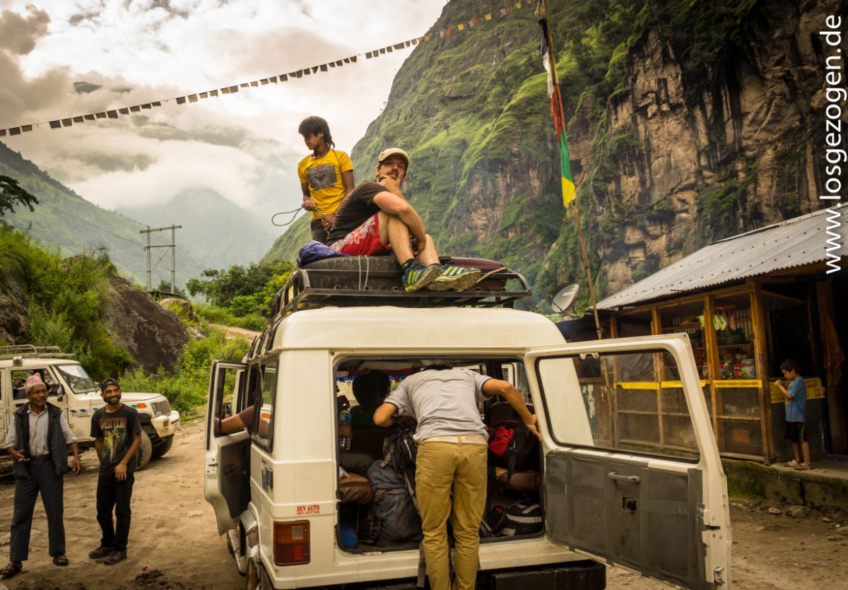 An diesem Tag hatten wir noch die Sorge das wir den Trek in nicht ausreichender Zeit schaffen würden, um rechtzeitig bis zu unserem Rückflug in Kathmandu zu ein. Wir hatten außerdem keine Ahnung wie lange es wirklich dauern würde und in der Abgeschiedenheit der Berge kommt es dazu in der Regel anders als man denkt. So waren viele unserer vorherigen Erfahrungen. Wir waren außerdem noch nicht an das Marschpensum adaptiert und nach acht Stunden machte sich die erste Erschöpfung bemerkbar. Am nächsten Tag mussten wir sicherlich mindestens 12 Stunden laufen um das Extra-Pensum zu packen. Wir freuten uns deshalb, als kurz nach dem Erdrutsch ein Jeep mit Mensch und Material überholte. Wir forderten Sie auf zu stoppen und wollten auf das total überladene Fahrzeug aufspringen. Es gab allerdings keine Sitzplätze im Inneren mehr. Sie wollten uns einfach nicht mitnehmen. Auf dem Dach war neben dem Gepäck allerdings noch Platz. Theoretisch.... Zumindest für Nepalesen. Erst hiess es nämlich: Ausländer und besonders Frauen dürfen nicht auf dem Dach sitzen. Es sei zu gefährlich. Neben dem Weg ging es oft mehrere hundert Meter in die Tiefe. Während noch wild diskutiert wurde, das wir keinen Platz auf dem Geländewagen bekommen könnten, saß Corinna inzwischen längst auf einem Hartschalenkoffer oben auf dem Dach und grinste herunter. Was sollten sie da noch machen? Schnell versuchten die Nepalis noch die unten sitzende Männer gegen Corinna auf dem Dach zu tauschen. Sie bestätigte von oben sie wolle definitiv keine (Ausländer)- Sonderbehandlung und jemanden den Platz weg nehmen. So durfte auch Olli dann auf einem Reifen auf dem Dach Platz nehmen. Das akzeptierten Sie dann kopfschüttelnd und es ging endlich los.