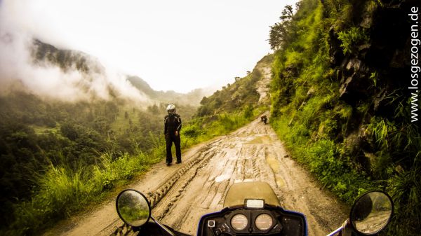 Nicht so in Nepal. Hier lagen wirklich riesige Felsbrocken und loses Erdreich über ein 100 m großes Teilstück völlig verstreut. Jederzeit war die Möglichkeit weiterer Abbrüche gegeben. Der Boden war von den letzten Tagen völlig aufgeweicht. Aus europäischer Sicht ein Ding der Unmöglichkeit. Lebensgefahr! Betreten verboten! Durch die europäische Brille sah man überall imaginär die großen Warnschschilder mit der entsprechenden Aufschriften aufpoppen. Nicht so hier. Naja, wir waren ja inzwischen auch ziemlich weit von Europa entfernt. Hier zählte Improvisation. So standen schon auf beiden Seiten Träger vor mehreren Jeeps die ihre Beladung in Form von Gütern aller Art über die Stelle schleppten. Es war nicht mal der kleinste Bagger zu sehen. Wir hörten, man wolle die Straße in 1-2 Monaten wieder herstellen, wenn der Monsun vorüber sei. Bis dahin war die einzige Straßenverbindung unterbrochen.