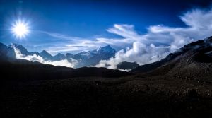 In den Gegenden der Sherpas werden alle Entfernungen in Marschstunden gerechnet. Sechs Stunden hier hin, eine Stunde da hin. Nach zwei Stunden waren wir immer noch einiges von Danaqyu entfernt und es dämmerte schon. Die angegebenen Zeitstunden stimmten meistens, wenn man wie die Sherpas ohne Pausen durchmarschierte.