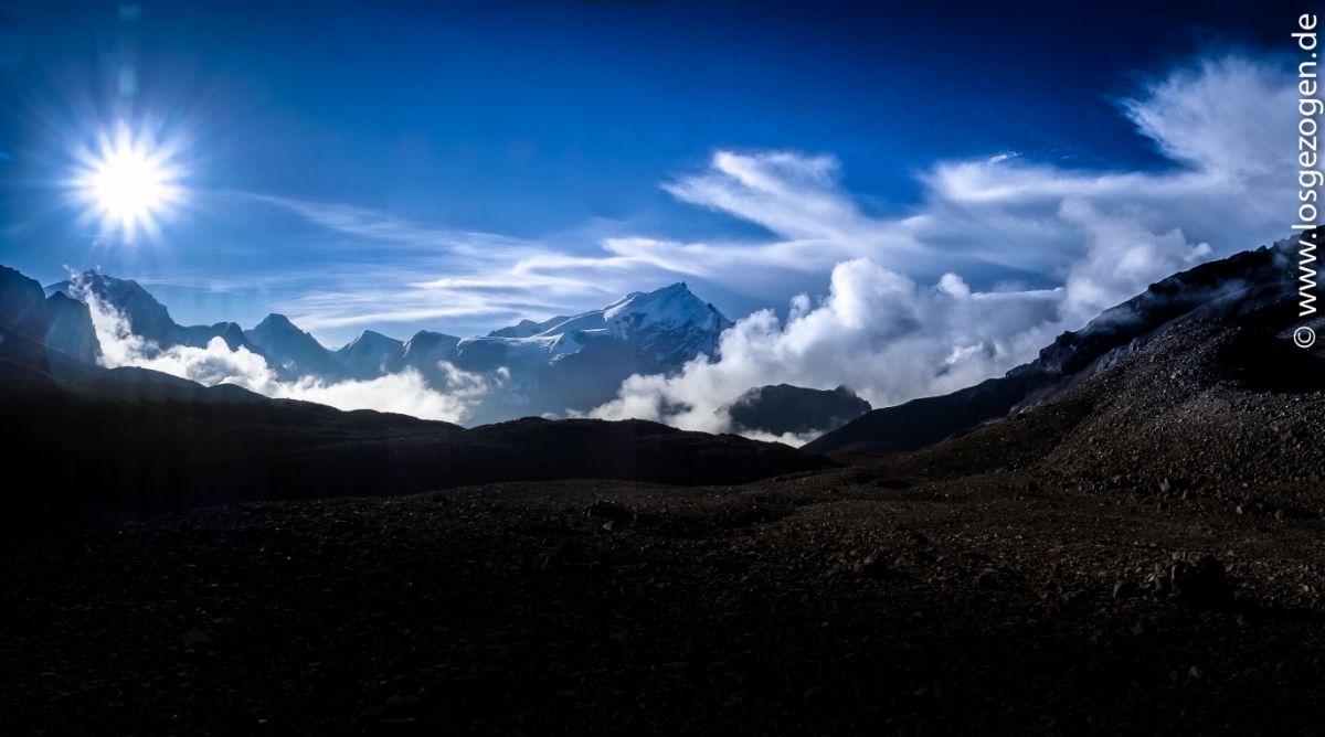 Hier verstanden wir ihn. Wir fühlten uns frei, wir fühlten uns zeitlos und dennoch so klein. Umgeben von den hoch in den Himmel ragenden Berggipfeln. Wann tritt dieser Zustand jedoch ein? Wenn man allen Luxus und den ganzen Alltag hinter sich lässt oder ist es nur eine Frage der Umgebung? Das Zeitwandern hat uns nachdenklich gemacht. Hatten wir nicht mit dieser Motorradreise den all zu großen Komfort schon lange hinter uns gelassen?