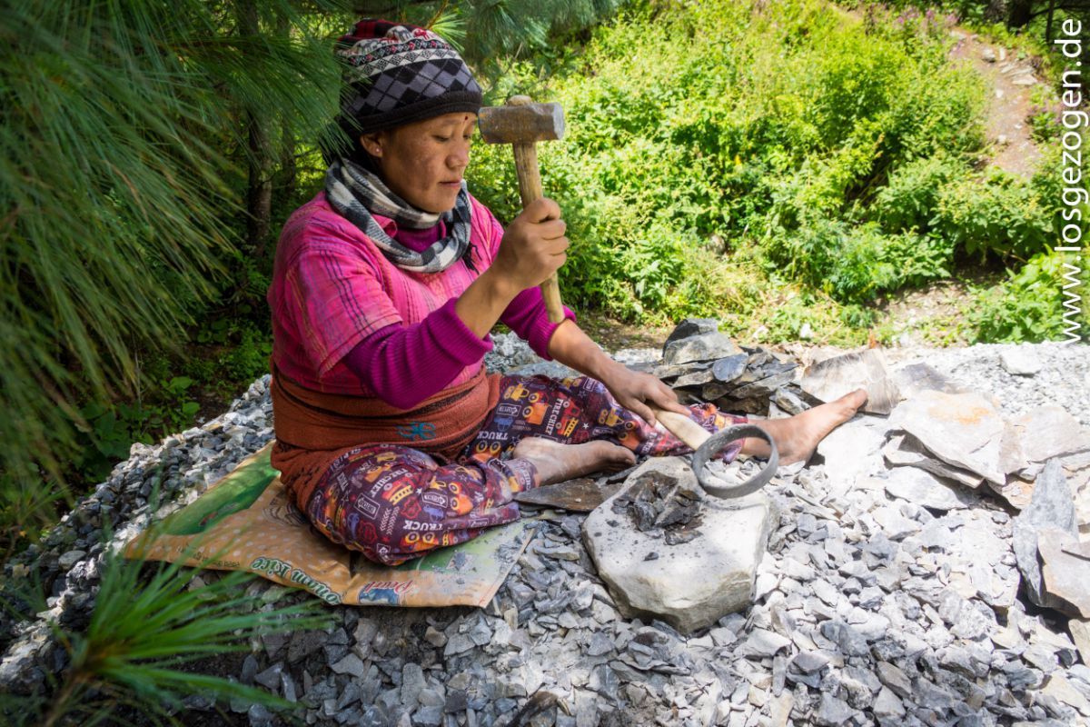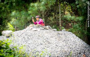 Eine Frau beim Zertrümmern von Felsen für einen neu zu bauenden Weg saß neben dem Pfad. Besser gesagt. Sie saß auf einem riesigen Berg, den sie wohl in den letzten Tagen oder gar Wochen erarbeitet hatte!? Unter ihr wurde er wohl nur langsam immer größer. Wir fragten sie wie lange sie wohl dafür gebraucht haben möge. Konnten ihre Antwort aber nicht verstehen. Von Hand zertrümmerte sie weiter unermüdlich große zu kleinen Steinen. Eine aus unserer Sicht absolut monotone, mühsame und anstrengende Arbeit. Trotzdem schien sie frohen Mutes und lachte uns entgegen. Das beeindruckte uns zutiefst. Abgerechnet wurde anscheinend per Sack, den der Sohn auf dem Rücken tragend abholte.