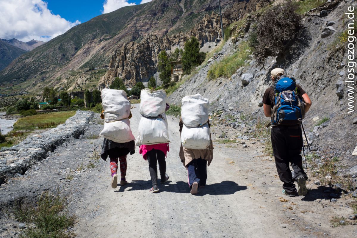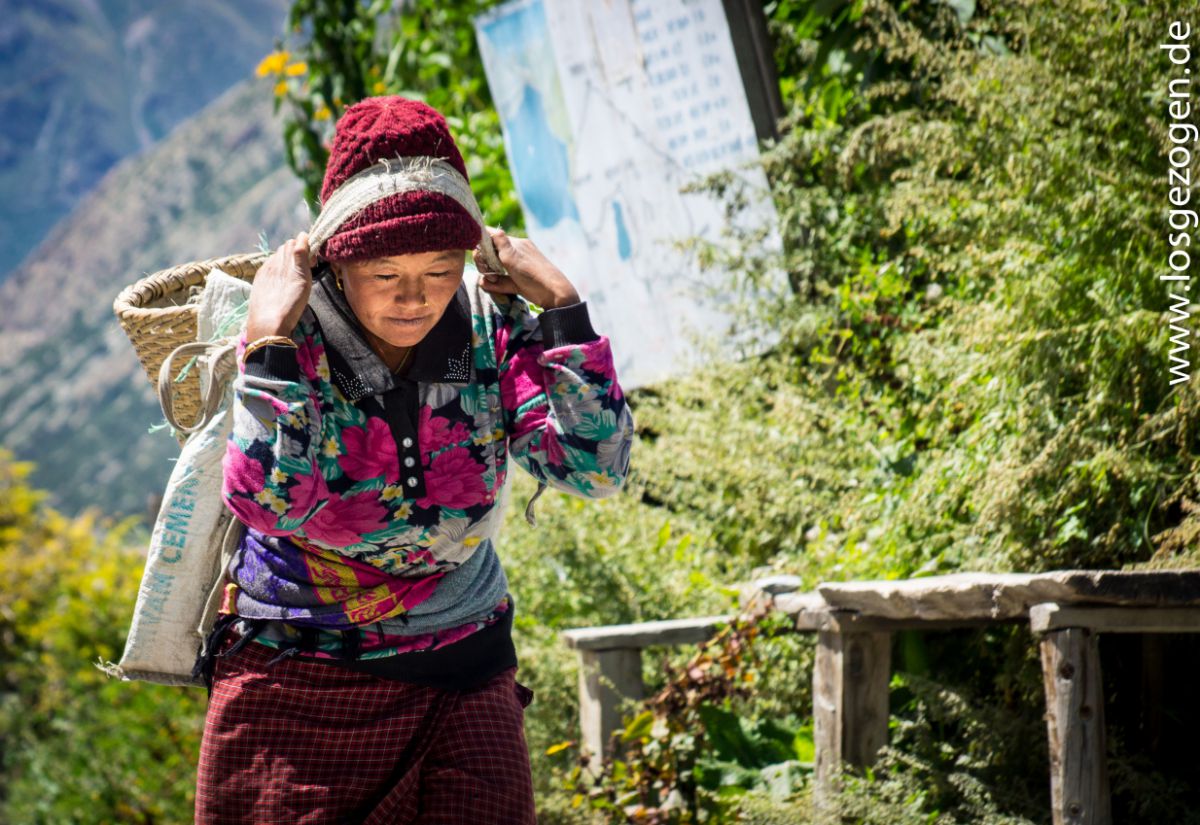 Die Tragevariente der Sherpas war dabei wirklich bemerkenswert. Die schwere gepackten Sporttasche wurde mit Hilfe eines Gurtes einfach vom Kopf gehalten. Eine Methode die uns zunächst fremdartig erschien. Haben wir als Westler doch gerne alles direkt auf dem Rücken und halten diese auch als am ergonomischten. Da wir wohl wirklich inzwischen topfit waren, stellte sich Olli seinem persönlichen Selbstversuch, bei welchem er sein Gepäck mit dem vom Träger der Koreanerin für eine Weile tauschte. Es stellte sich heraus, dass es gar nicht so schwer war. Die Nackenmuskulatur wird zwar auf Dauer etwas Training benötigen, aber die Tragevariante war ansonsten ganz praktikabel. Alsbald ließen wir die Gruppe hinter uns.