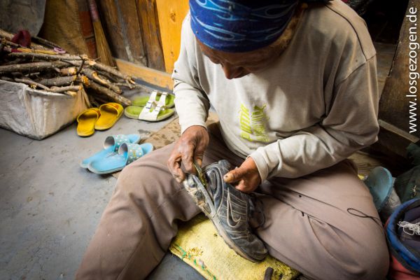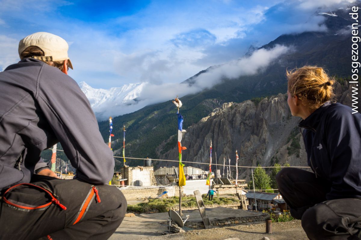 Ab Manang (3.519 m) wollten wir es ein bisschen vorsichtiger angehen lassen. Vor Ort ließen wir am Nachmittag Cocos Schuhe bei dem örtlichen Schuster reparieren. Ihre Sohle, bei ihren in Pakistan gekauften Billigturnschuhen fiel einfach ab. Damit waren wir jedoch immer noch besser ausgestattet als so mancher Sherpa mit Badeschlappen. Während sie repariert wurden, stiegen wir beim Schuster aufs Dach und blickten weit über Manang zu den verschiedenen Gipfel der Annarpurna.