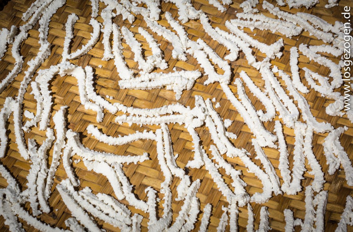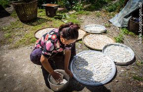 In einem kleinen Restaurant verarbeitet die Hausmutter gerade die Yakmilch, die hier unter anderem zur Käsezubereitung diente. Die frische Creme wurde durch ihre Finger auf Körbe gepresst, um sie in der Sonne trocknen zu lassen. Somit wurden sie haltbar gemacht, um auch im Winter dann Käse zu haben. Ein karges, hartes Leben auf dem Dach der Welt. Mit rauem Wetter und brennender Sonne.