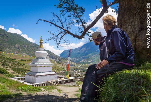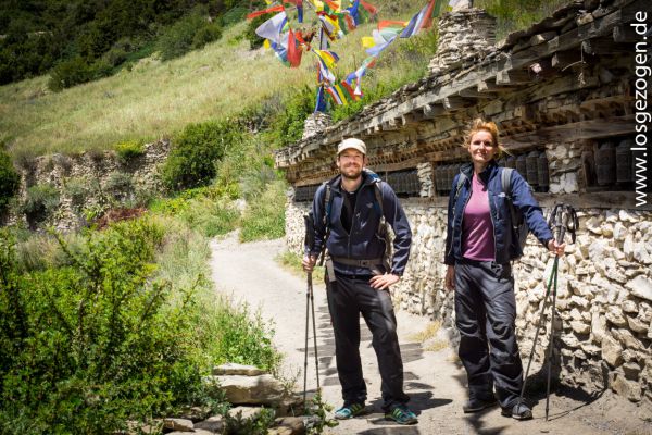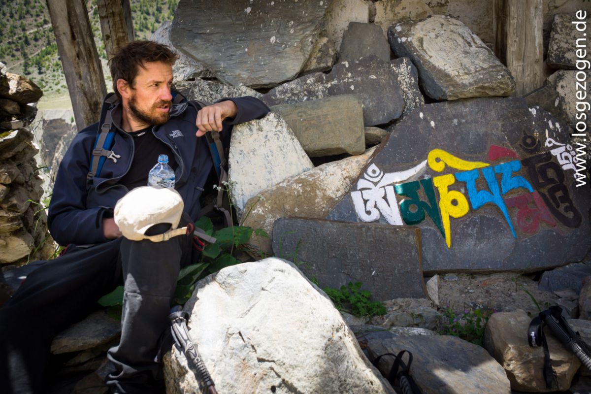 Wir waren zeitmäßig hier allerdings in einer Zwickmühle und einigten uns auf ca. 500 m Aufstieg wenigstens am ersten Tag und hofften das noch eine Resterhöhung der roten Blutkörperchen aus Ladakh in unseren Körpern seien möge. Die Weiten, die Höhe und die spektakuläre Berglandschaft machten den weiteren Weg einfach unvergesslich und ließen uns den unermüdlichen Marsch trotz des merklich geringer werdenden Sauerstoffs und der Minderleistung irgendwie leicht erscheinen. Wir konnten uns einfach nicht sattsehen. Der Übergang vom Hinduismus zum Buddhismus mit seinen Stupas, Fahnen und Tempeln inklusive den Gebetsmühlen ließ die Strecke weiter spannend bleiben.