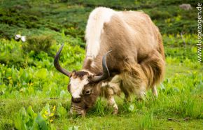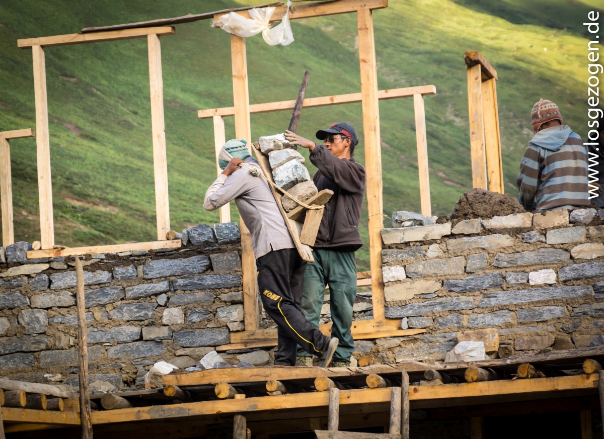 Am Rande des Weges entstand ein Haus und nahezu das gesamte Baumaterial wurde direkt im Umkreis entnommen. Steine aus zugehauenen Felsen wurden aufgemauert und mit selbst angerührtem Mörtel aus gesiebter Erde, Wasser und Lehm auf dem Rücken herangetragen. So entstand Stück für Stück ein Haus. Auf der Ebene davor grasten die Yaks. Mit ihrem prächtigen Behang sahen sie ganz friedlich aus, waren jedoch auch für Kämpfe untereinander aufgelegt, bei welchen sie sich über die Ebene jagten.