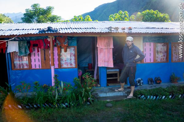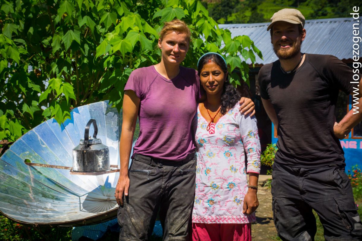 Am späten Nachmittag des darauf folgenden Tages in Ngadi waren wir beim Ankommen dann überglücklich, als Tim und Lilly noch dort standen, wo wir sie vor sieben Tagen verlassen hatten. Große Erleichterung sie unversehrt zu sehen. Da das Guesthouse wirklich nur aus Hütten bestand, mussten wir unsere Klamotten erstmal auslüften. Der Monsun hatte hier im subtropischen Bereich heftig zugeschlagen und alles war feucht und teilweise auch schimmelig. Uns war das allerdings völlig egal. Wir waren erschöpft, aber zufrieden es gemeistert zu haben. Die Besitzerin kochte uns einen Tee auf dem Solarofen den hier so viele Familien zur Reduzierung der Waldrodung für Feuerholz und daraus resultierenden Folgen von Spendenorganisationen bekommen haben.