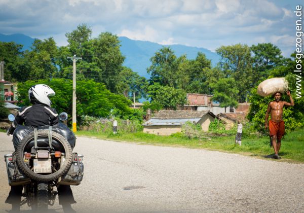 Unser Navigationssmartphone am Motorradlenker war leerglutscht, das Ladekabel ließ sich in der Hektik am Vormittag nicht finden, wir fuhren auf einer Straße auf welcher wir nicht sein wollten und eigentlich war die Grenze nur 30 km weit weg. So zu mindestens der letzte Stand, bevor die elektronische Navigation versagte. Kurz gesagt: Wir hatten uns total verfahren. Wer dachte denn daran, dass Nepal so schwer zu finden war. Der Verkehr tat mal wieder sein übriges dazu, um uns auf dieser Irrfahrt vollends zu zermürben. Siehe unseren Bericht: "Schwimmen im Haifischbecken bzw. Motorradfahren am unteren Ende der Nahrungskette“