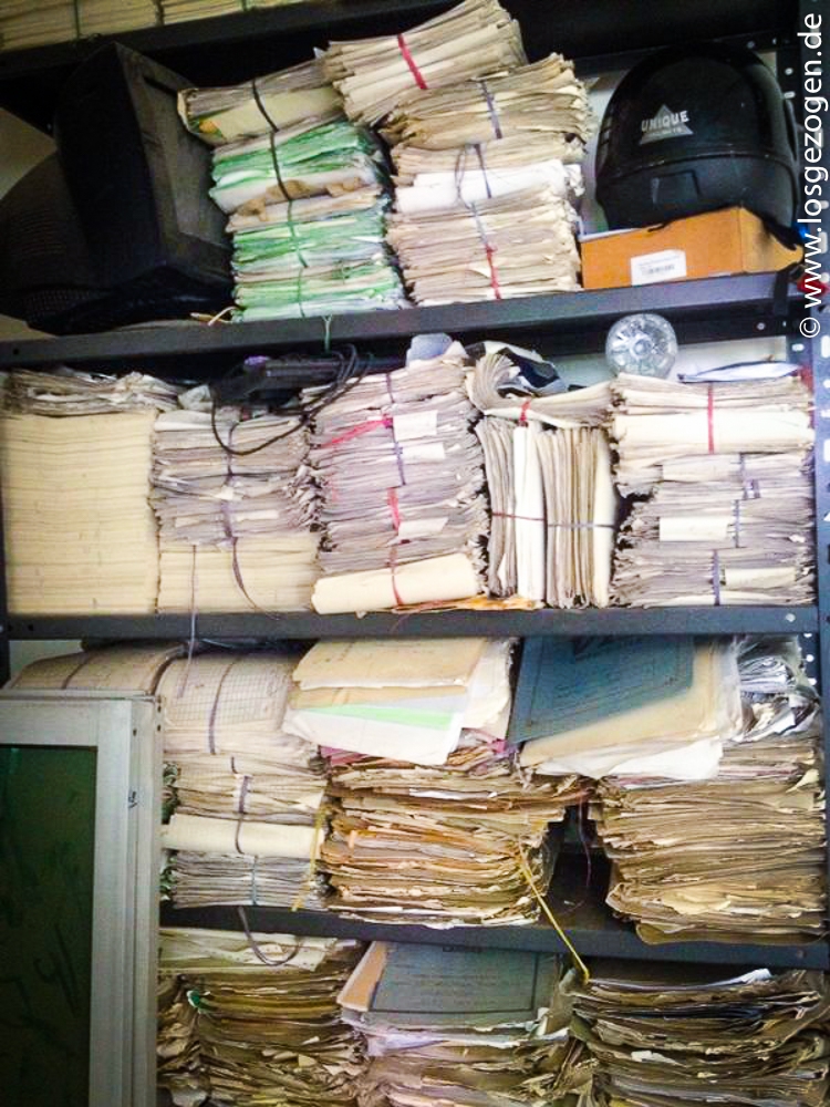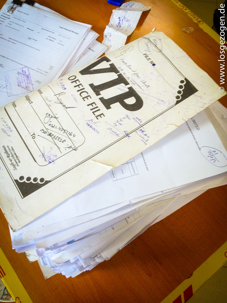Hintergrund ist wohl der, das möglichst viele Leute unterschreiben müssen um der Korruption vorzubeugen. Da das nicht unbedingt auf kleinster Ebene am schlimmsten ist, sondern der Fisch bekanntlich meistens vom Kopf an stinkt, scheint dabei überhaupt keine Rolle zu spielen. Hier wurde fleissig bürokratisiert. Es war wirklich ein Irrsinn wer hier alles unterschreiben musste und für was eigentlich überhaupt? Die deutsche Bürokratie mag zwar manchmal zum Haare raufen sein, aber das ist nichts gegen den Zoll in Pakistan. Es wurde natürlich alles fein säuberlich kopiert. Leider gab es keinen Kopierer im Gebäude, deshalb wieder raus auf die Strasse zum Kopiermenschen. Dort gab es immerhin wieder Tee. In einem großen Raum mit hunderten Papierstapeln sahen wir auch wo die Akten gelagert wurden. Wir lernten das allseits praktizierte Haufenprinzip in neuen Dimensionen kennen.