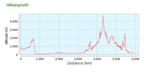 Taftan; Dalbandin; Quetta; Jacobabad; Sukkur; Multan; Sahiwal; Lahore; Islamabad; Abbottabad; Mansehra; Besham; Chilas; Gilgit; Karimabat; Gulmit; chinesische Grenze; Skardu